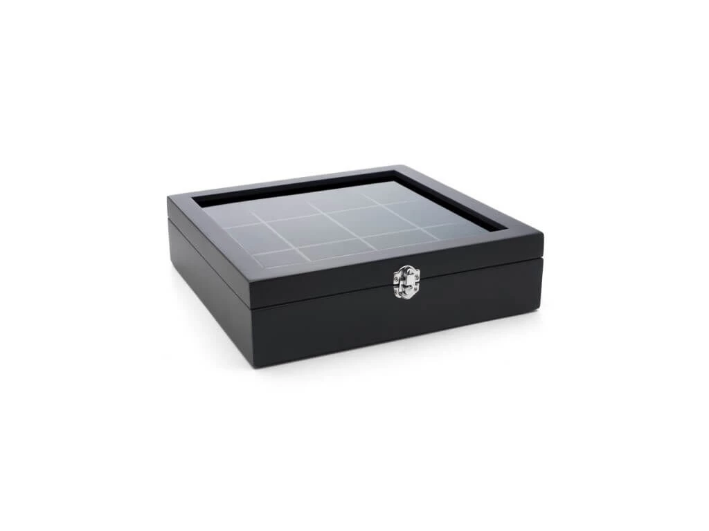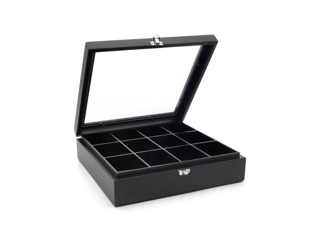 De theedoos van Bredemeijer is gemaakt van zwart gekleurd hout en voorzien van een glazen venster in het deksel. De kist heeft een afmeting van 28,5 x 27 x 7 cm (l x b x h). De kist heeft 12 vakken voor het opbergen van theezakjes.