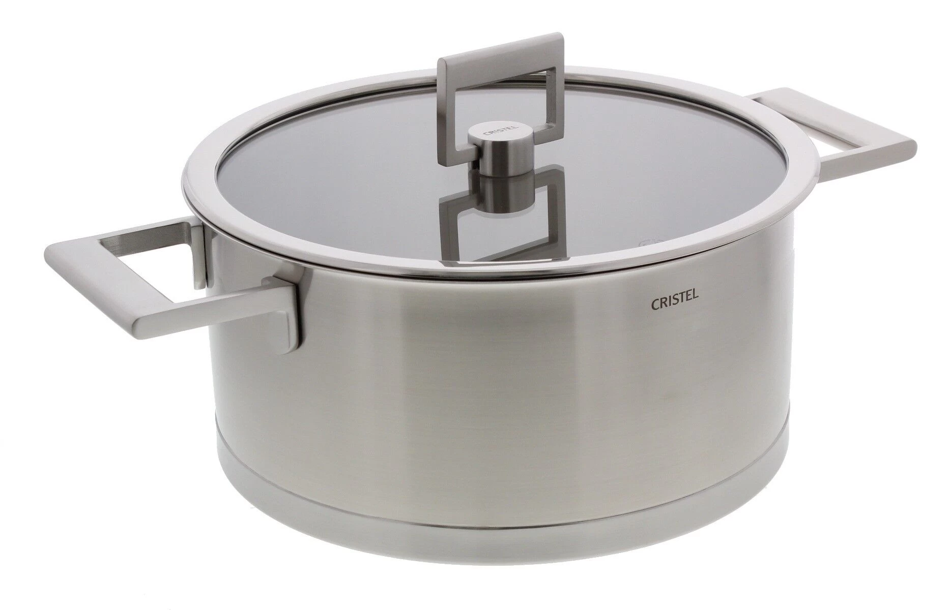 De Cristel Strate kookpan met glazen deksel heeft een diameter van 24 cm. De pan is 11,5 cm hoog en heeft een inhoud van 5,1 liter. Bij de pan zit een plat glasdeksel met een neerklapbare handgreep. Het deksel is voorzien van een metalen stootrand waardoor het deksel beter tegen breuken beschermd wordt. De handgrepen zitten vast aan de zijkant van de pan gemonteerd en door het ranke ontwerp zijn de pannen stapelbaar. Gebruik de kookpan voor het garen van allerlei verschillende gerechten.