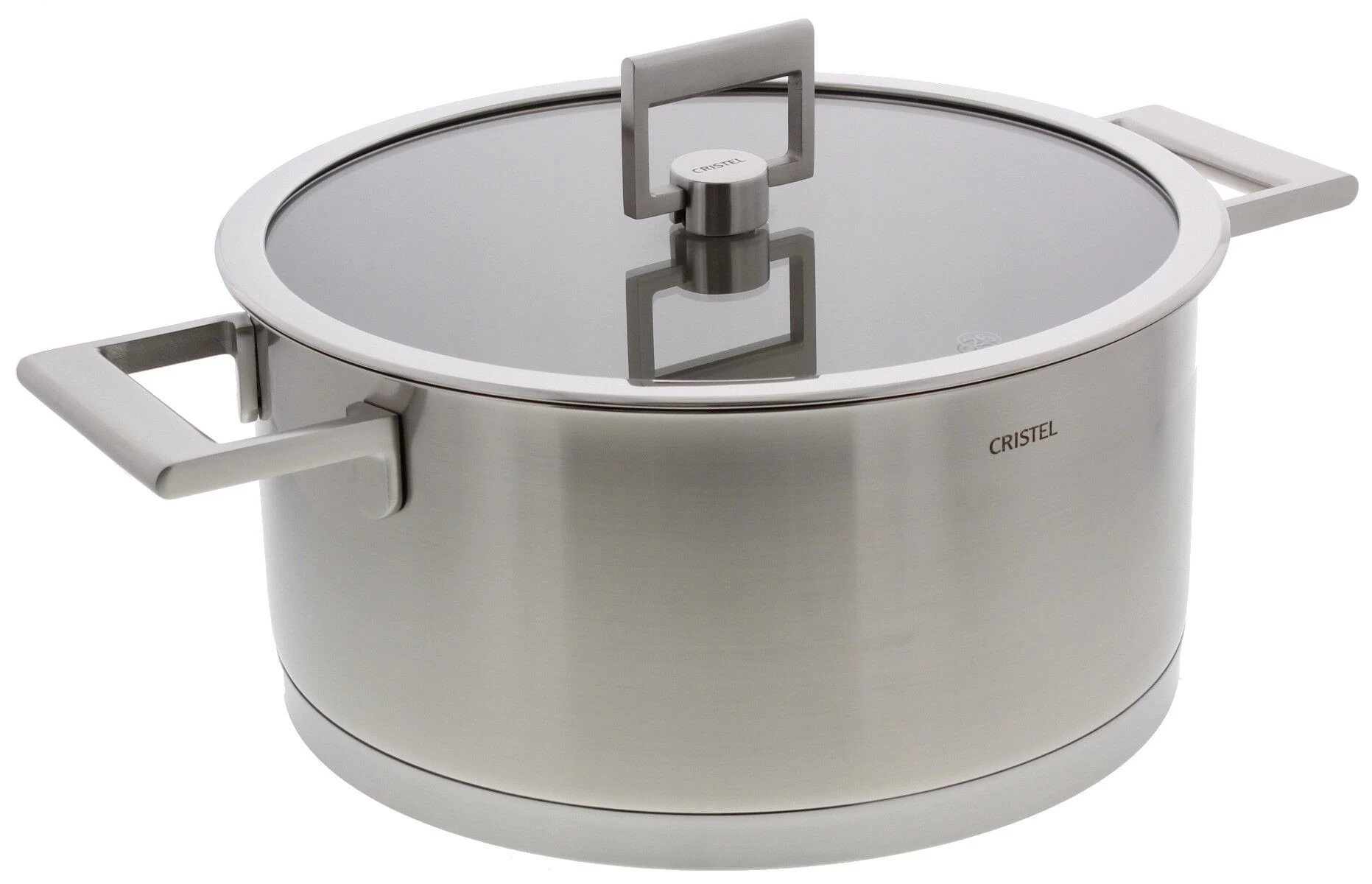 De Cristel Strate kookpan met glazen deksel heeft een diameter van 26 cm. De pan is 12,5 cm hoog en heeft een inhoud van 6,6 liter. Bij de pan zit een plat glasdeksel met een neerklapbare handgreep. Het deksel is voorzien van een metalen stootrand waardoor het deksel beter tegen breuken beschermd wordt. De handgrepen zitten vast aan de zijkant van de pan gemonteerd en door het ranke ontwerp zijn de pannen stapelbaar. Gebruik de kookpan voor het garen van allerlei verschillende gerechten.