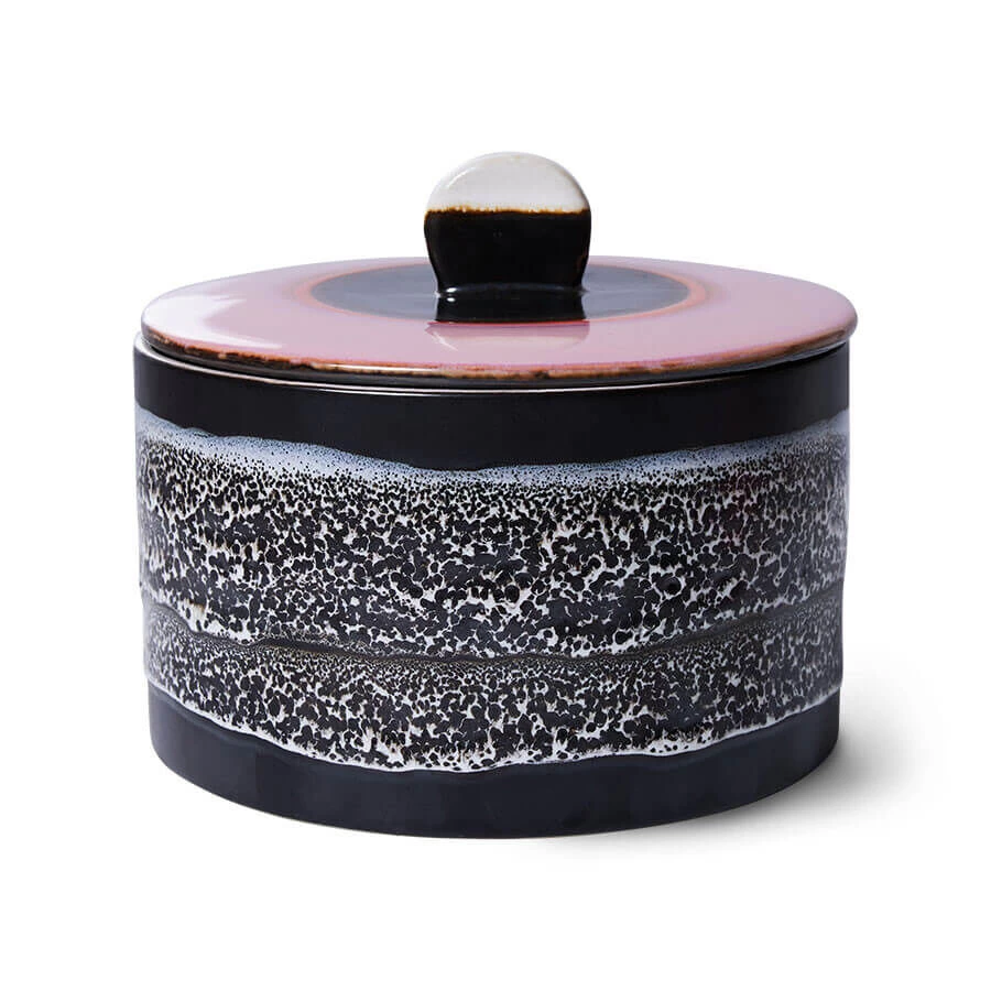 Voor het ontwerp van de 70’s Disco voorraadpot heeft HK Living zich laten inspireren door de jaren 70. De kleuren doen denken aan toen, maar geven het design ook een natuurlijke touch. De aardewerken pot, met een inhoud van 1,65 liter, heeft een diameter van 17 cm en een hoogte van 14 cm. De deksel is voorzien van een siliconen afsluitstrip, waardoor uw zelfgebakken koekjes of andere lekkernijen lang goed blijven.