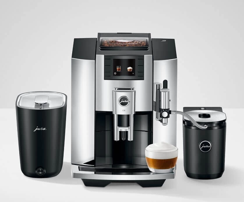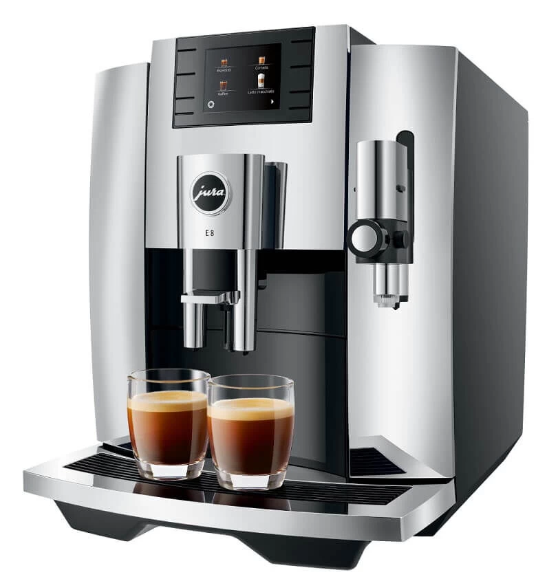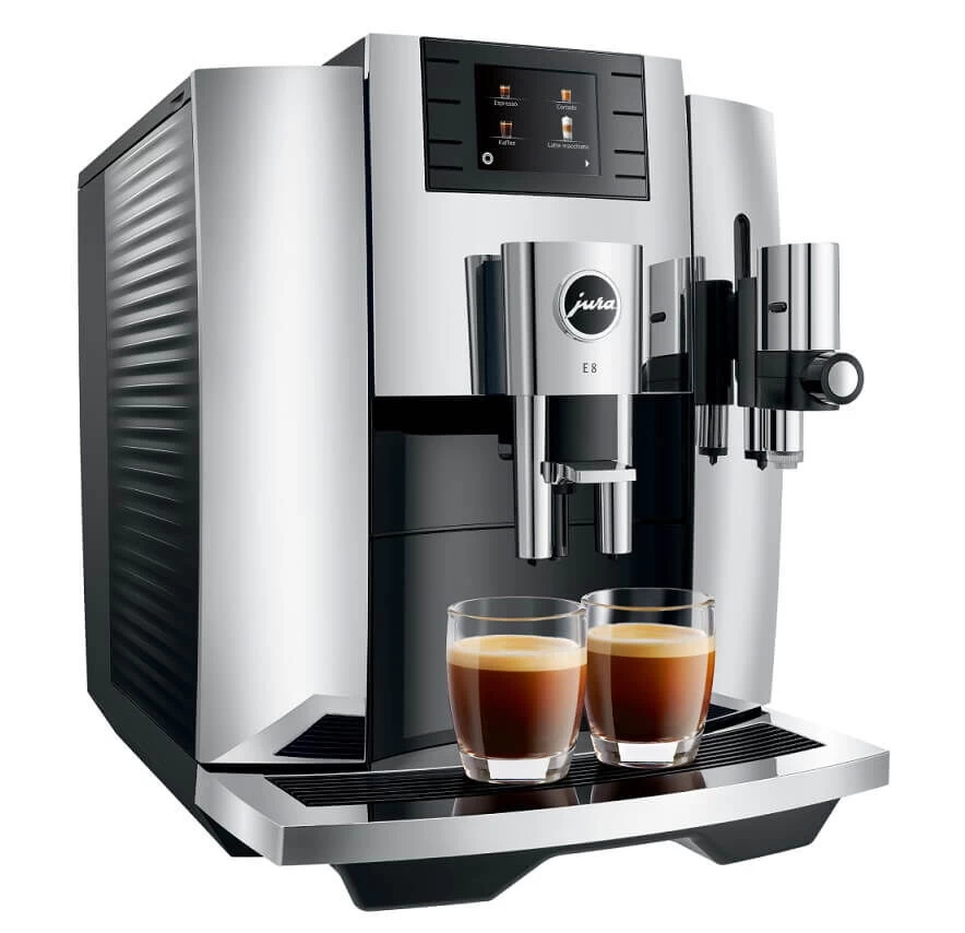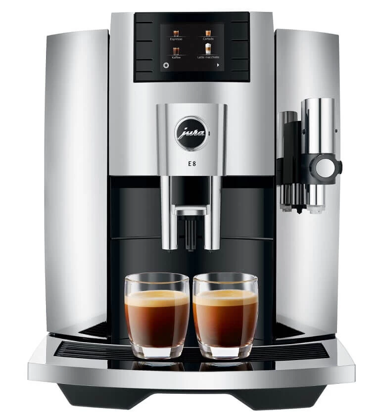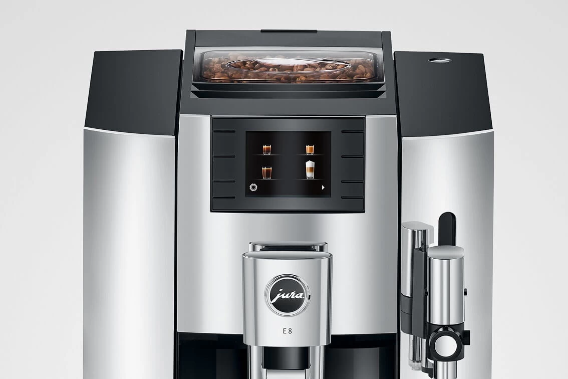 Met de JURA E8 zet u verschillende koffiespecialiteiten, zoals latte macchiato en espresso. De E8 is een zeer compacte volautomatische espressomachine die met 1 druk op de knop cappuccino en 12 andere individueel programmeerbare specialiteiten kan bereiden uit hele of gemalen koffiebonen. De machine wordt heel eenvoudig aangestuurd vanaf het grote 2,8″ kleurendisplay aan de voorzijde.