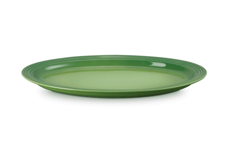 De ovale schaal van Le Creuset is gemaakt van Bamboo, groen, geglazuurd aardewerk. De lengte van de schaal is 46 cm, de breedte 31,5 cm en heeft een hoogte van 3,2 cm. Gebruik de schaal om bijvoorbeeld een salades te serveren.