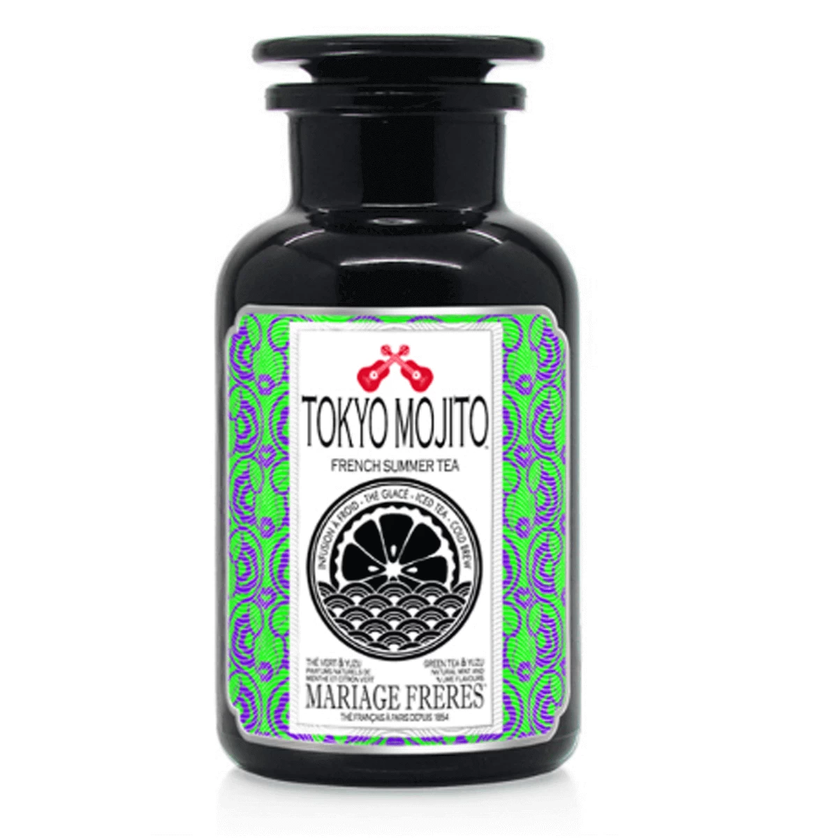Een hoogwaardige dorstlesser bij hoge temperaturen! Mariage Frères Tokyo Mojito ijsthee komt in een glazen pot met 140 gram losse theeblaadjes. De inhoud is voldoende voor het maken van 24 liter ijsthee. De ijsthee is op basis van Japanse yuzu, munt en limoen en heeft een frisse smaak.
