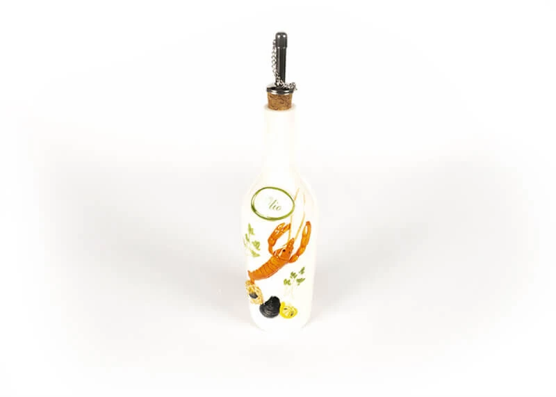 De Oldenhof olijfoliefles is gemaakt van wit aardewerk en is gedecoreerd met zeevruchten. De inhoud van het fles is 500 ml en heet een afmeting van 30cm hoog en 9cm breed. Gebruik de olijfoliefles voor het doseren en serveren van (olijf)olie.